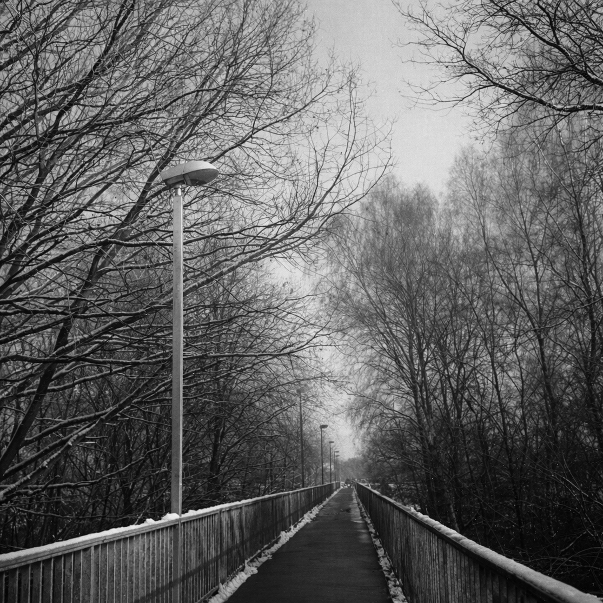 Die Bilder zeigen nichts Besonderes. Und genau darin liegt ihre Arbeit. Helge geht hinaus, nicht um etwas zu finden, sondern um zu sehen, was bleibt. Schnee, Wege, Ränder, Bäume, ein Mast, eine Brücke – Orte ohne Ereignis, ohne Ziel, ohne Entscheidung im emphatischen Sinn.