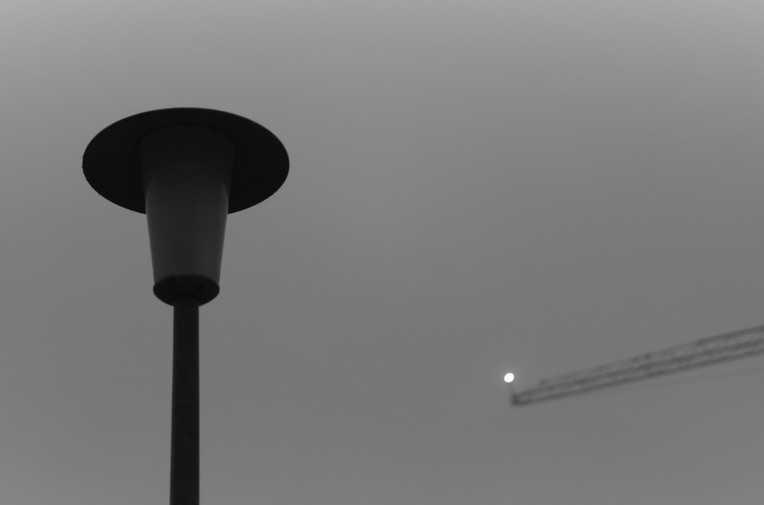 Auf dem Weg zur Bushaltestelle stehen wieder der Kran und die Laterne. Ich gehe an ihnen vorbei, die Kamera bereits in der Hand. Es wirkt, als setzten die beiden ein Gespräch fort, das gestern begonnen hat und heute ohne Eile weiterläuft. Ich höre nichts, aber ihre Nähe ist mir vertraut, als hätte ich sie erwartet.