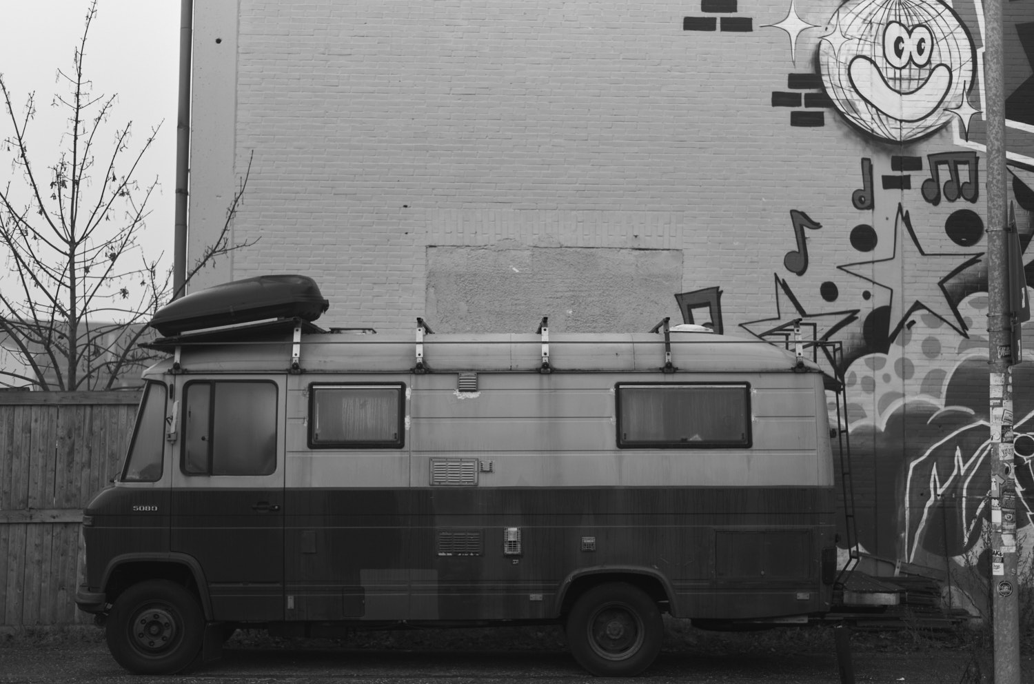 Um die Ecke steht ein altes Wohnmobil. Es wirkt wie ein Überbleibsel aus einer anderen Zeit, als sei es gerade aus der Wüste hierhergerollt. Für einen Augenblick fühlt es sich nicht nach 2025 an, sondern eher nach 1984.