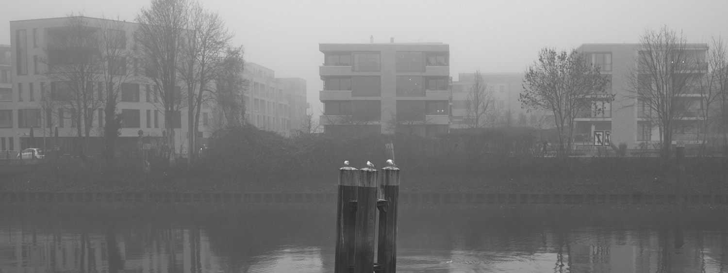 Am Ende der Brücke wende ich mich dem Hafen zu. Das Neubaugebiet wirkt wie ein Zitat aus einer anderen Stadt, ein kleines Stück Hamburger Hafencity, hierher verschoben. Lange konnte man diese Seite nicht betreten. Jetzt stehen dort Wohnungen. Ich hebe die Kamera, senke sie wieder.