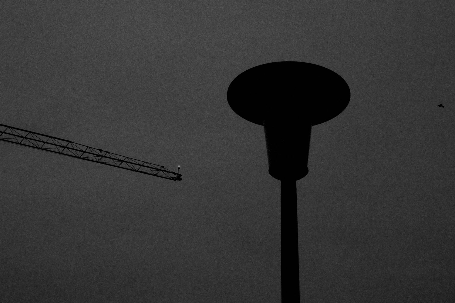 Auf dem Weg zur Bushaltestelle sah ich wieder die Laterne und den Kran. Die Laterne brannte, der Kran ruhte dunkel daneben. Sie standen da wie zwei, die ihr Gespräch vom Vortag fortsetzen, ohne sich beeilen zu müssen.
